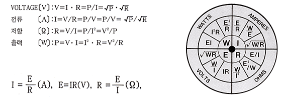 I=전류(Ampere)(A), E=전압(Volt)(V),